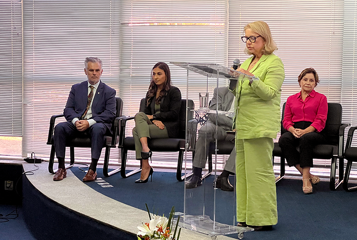 Todos unidos no enfrentamento à violência contra a mulher. O Tribunal de Justiça do ES (TJES) por meio da Coordenadoria Estadual da Mulher em Situação de Violência Doméstica e Familiar (Comvides), realizou na tarde desta sexta-feira, 06 de março, a abertura da Semana Justiça pela Paz em Casa. A Presidente do TJES, Desembargadora Janete Vargas Simões marcou presença ao lado da Supervisora das Varas de Violência Doméstica do TJES, Desembargadora Rachel Durão Correia Lima; o Diretor da Escola da Magistratura do ES (Emes), Desembargador Júlio César Costa de Oliveira; a Secretária do Estado de Mulheres, Jacqueline Moraes; o Corregedor do Tribunal de Conta do Estado do Espírito Santo, Conselheiro Domingos Augusto Taufner; a Promotora de Justiça Coordenadora do NEVID, Doutora Cristiane Esteves Soares e a Defensora Pública, Doutora Laís Pereira Lima Ribeiro, estiveram presente na mesa de honra do evento.