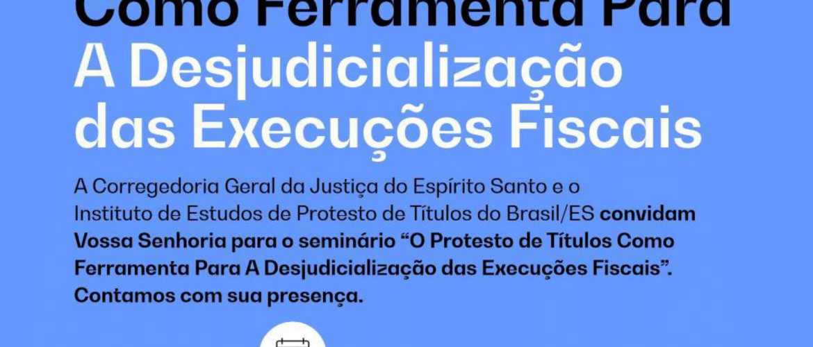 A Corregedoria Geral da Justiça do Espirito Santo e o Instituto de Estudo de Protesto de Títulos do Brasil/ES convidam Vossa Senhoria para o seminário “O Protesto de Títulos Como Ferramenta Para A Desjudialização das Execuções fiscais”.