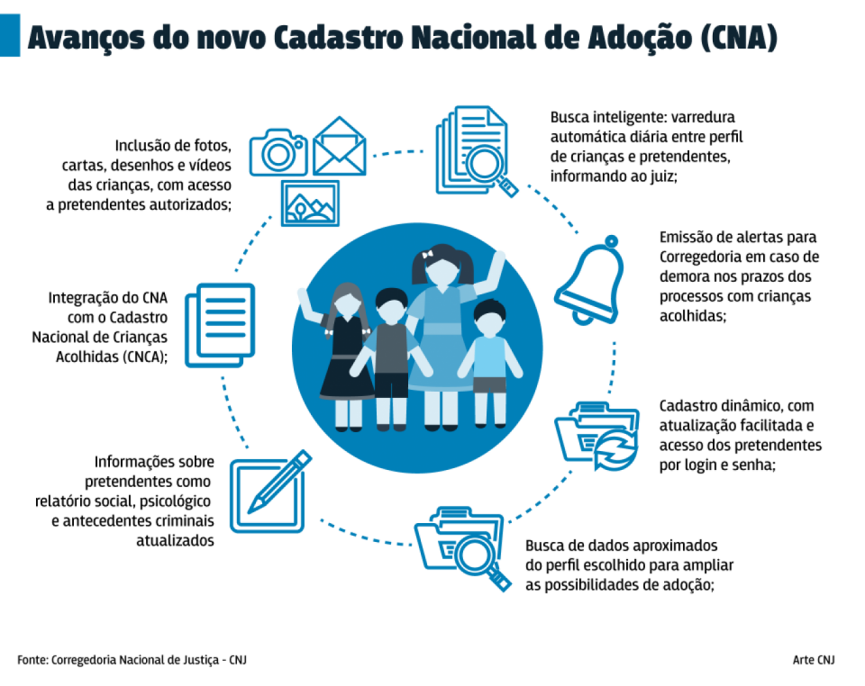 Mais de nove mil adoções foram realizadas por intermédio do CNA no Brasil, desde que o cadastro foi criado pelo CNJ em 2008. Atualmente, há 43,8 mil pretendentes cadastrados e 8,8 mil crianças e adolescentes à espera de uma família.Pelo cadastro, as varas de infância passaram a se comunicar com mais facilidade, possibilitando as adoções interestaduais.