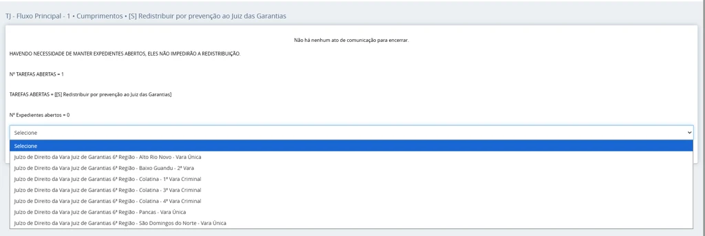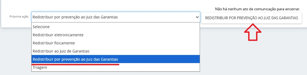 Escolhida a ação “REDISTRIBUIR POR PREVENÇÃO AO JUIZ DAS GARANTIAS”, o sistema disponibilizará todas as opções disponíveis, conforme a região que tramita os autos a serem redistribuídos: