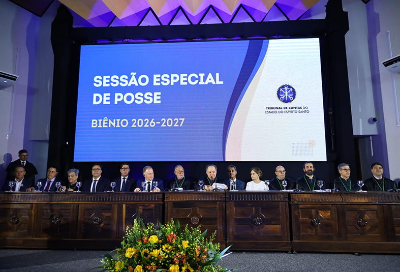 Casa cheia e com muitas autoridades presentes na cerimônia de posse do novo presidente do Tribunal de Contas do ES (TCE-ES), Luiz Carlos Ciciliotti, para o biênio 2026-2027. A presidente do Tribunal de Justiça do ES, Desembargadora Janete Vargas Simões participou da solenidade ao lado dos conselheiros do TCE-ES, do Governador Renato Casagrande, vice-governador, Ricardo Ferraço, do presidente da Assembleia Legislativa, deputado Marcelo Santos e do procurador-geral de Justiça, Francisco Berdeal. O evento aconteceu na tarde desta segunda-feira, 15/12, no auditório do TCE-ES.